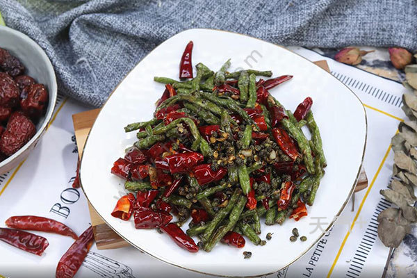 豇豆切段,姜切末,蒜切末,干辣椒剪成段,油温烧至7成热,放豇豆炸至微焦,捞出,留底油,爆香姜蒜末、花椒、干辣椒,放入豇豆炒匀,加入生抽1勺、盐半勺、鸡精半勺炒匀即可。