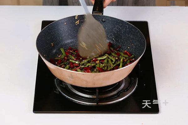 3.锅中留底油,爆香姜蒜末、花椒、干辣椒,放入豇豆炒匀,加入生抽1勺、盐半勺、鸡精半勺炒匀即可。