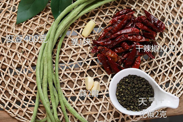 豇豆400克,姜1块,蒜2瓣,干辣椒10克,花椒2克,料酒1勺,生抽1勺;
