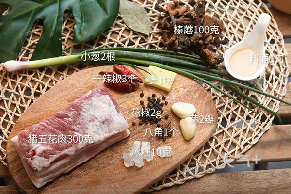 猪五花肉300克,榛蘑100克,小葱2根;