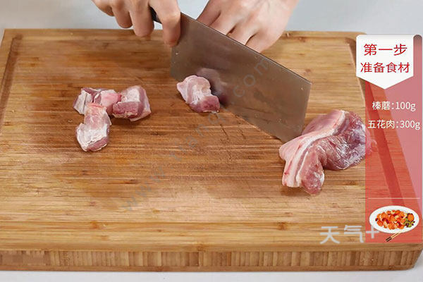 1.榛蘑放入清水中浸泡,五花肉洗净切块。姜切片,蒜切粒。葱切葱花;