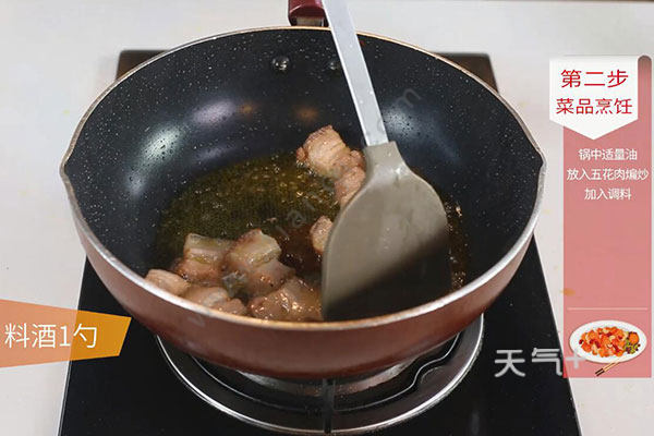 2.锅中放入适量油,油温烧至7成热,放入五花肉块大火煸炒至微焦,放入料酒1勺、生抽1勺、姜蒜片、八角1个、香叶2片、冰糖10克翻炒均匀。加入清水适量、老抽半勺大火煮开;
