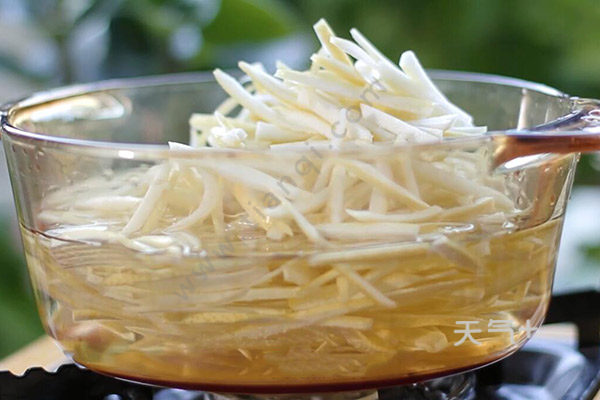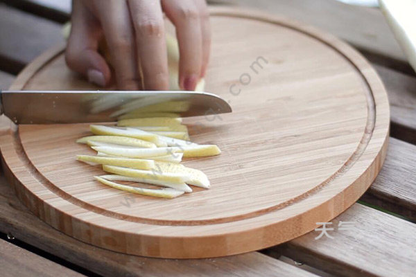 1.准备一盆清水,把柚子表皮沾湿,撒上盐搓洗干净,用刀削下柚子皮然后切丝,尽量不要切太厚。