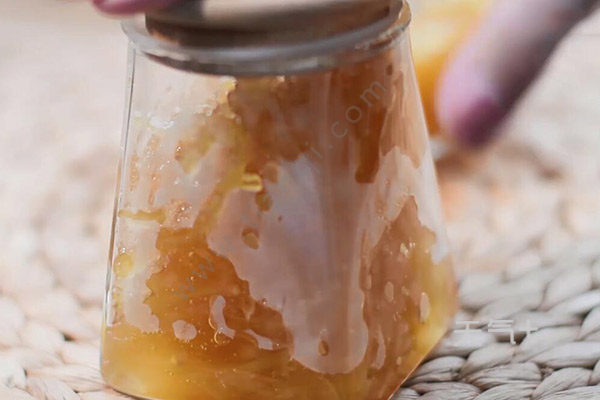 4.熬好的柚子放凉后,加入蜂蜜搅拌均匀,装入密封罐,放入冷藏室存放,喝的时候用温水冲泡即可。