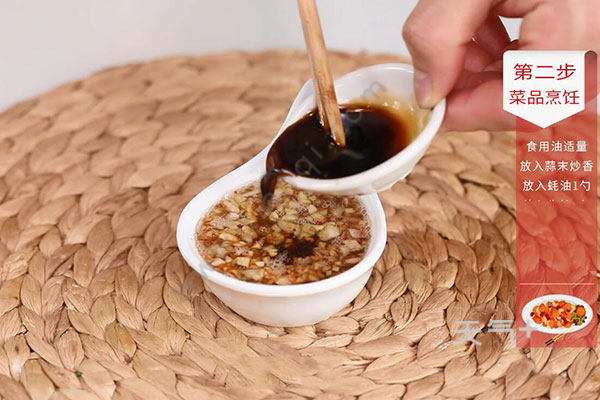 2.锅中放入适量油,油温烧至5成热,放入蒜末炒香盛出。放凉后放入生抽1勺、蚝油1勺拌匀。