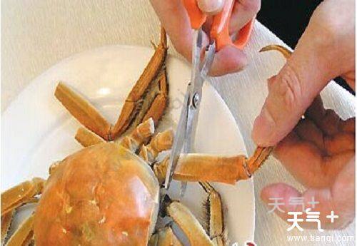 1、剪掉大闸蟹的八只脚,包括两只大钳,放凉后其中的肉会自动与蟹壳分开,很容易被捅出甚至是被吸出,因此要留待最后来吃;