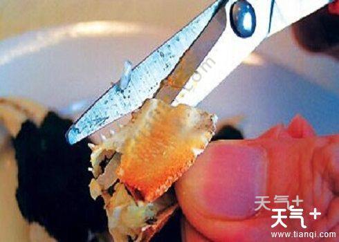 4、吃完蟹盖轮到蟹身,先用剪刀将多余的蟹脚、蟹嘴和蟹肺剪掉;