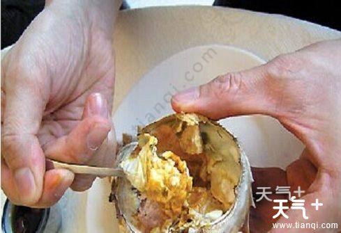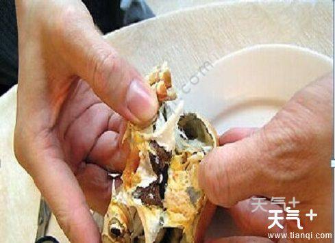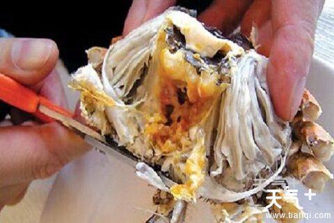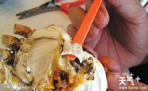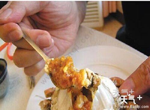 3、先吃蟹盖部分,用小勺把中间的蟹胃部分舀出,轻轻将外面包裹着的蟹黄吮干净。注意,不要吮破中间那个呈三角锥形的蟹胃,应将其丢弃;
