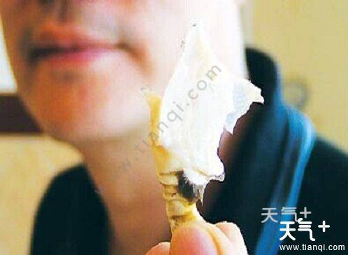 7、把蟹身掰成两半,此时可见成丝状的蟹肉。只要顺着蟹脚来撕,就可以将蟹肉拆出。吃干净的蟹壳是完整呈半透明状的;