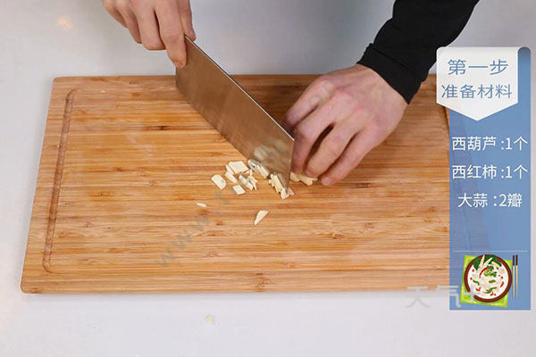 1.西葫芦洗净,对半切开后切片,西红柿去皮切小块,蒜切末、小葱切葱花;