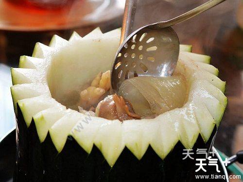 冬瓜盅是广东及上海地区汉族传统名菜。把冬瓜当作盛放馅料的容器,蒸制后食用,只是这个“容器”是可以吃的,选用老而肉厚的冬瓜,取出瓜内白瓤,造成盅形,在沸水中加热后捞起放在汤钵里,然后往冬瓜盅内注入上汤,放进瑶柱、莲子、苡米等材料,另用碟将盅口盖上,再用慢火炖两个半小时,取出冬瓜盅,用小刀切出盅内之瓜肉,只见汤水清香,瓜肉柔滑,是消暑的好菜。