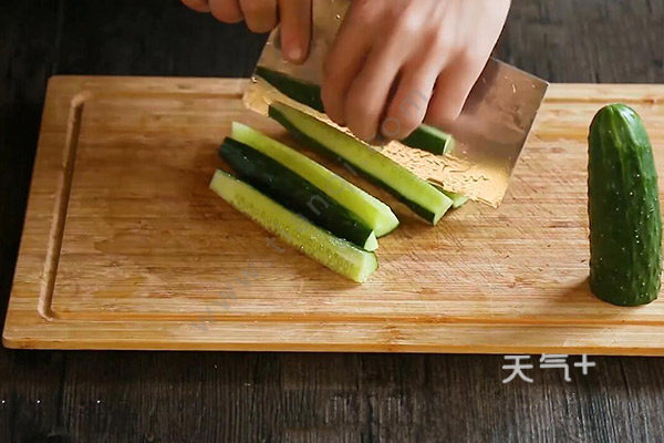1.黄瓜洗净,切长条,放入盐2勺拌匀腌制10分钟,腌好的黄瓜挤出水分放入碗中。