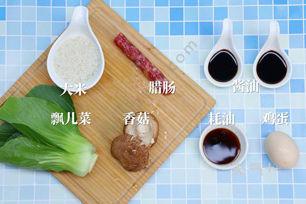 香菇和腊肠切片,大米浸泡一会儿,碗里倒入生抽、油、鸡精和盐,倒入水中拌匀,煲锅底刷一层油,倒大米和清水,将大米煮熟后放腊肠片和香菇片,再放瓢儿菜打一颗鸡蛋,煮一会儿再倒调料液,煮熟后即可食用。