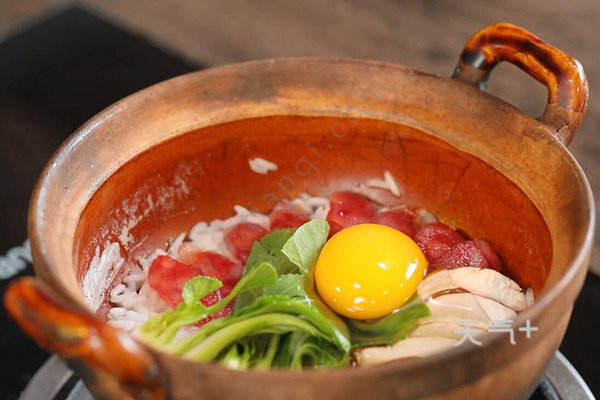 3.在煲锅底刷一层油,倒入大米和适量清水,将大米煮熟后放入腊肠片和香菇片,再放入瓢儿菜并打一颗鸡蛋。