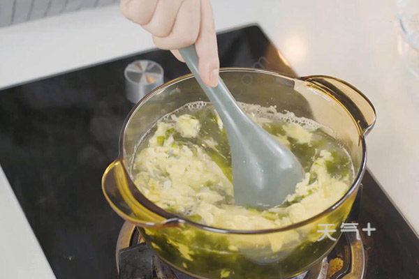 2.锅中加入适量水烧开后转小火,倒入蛋液,放入洗好的紫菜。