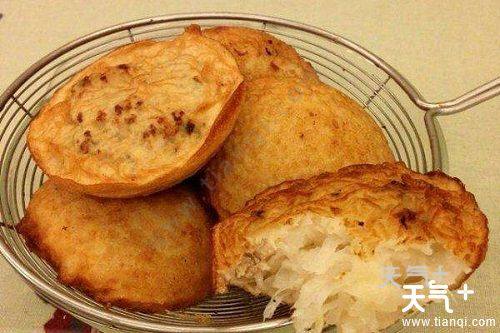 灯盏糕是浙江温州的特色名点,一种油炸食品,历史悠久。内馅是猪腿肉和黄屿萝卜丝,外皮用新黄豆和米粉浆拌和,采用鲜猪油炸制。因外形酷似古代扁圆形的菜油灯盏,故得名“灯盏糕”。