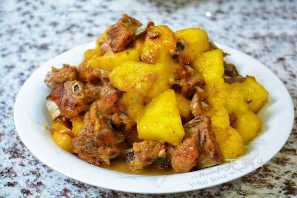 9.排骨炖熟后,菠萝排骨的做法 菠萝排骨的家常做法放菠萝翻炒均匀,然后盖上盖子大火焖个1-2分钟,让菠萝入味。