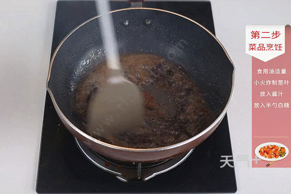 3.锅中放入适量油,油温烧至5成热,放入葱叶小火炸制,待葱叶酥脆即可取出。放入酱汁与葱油混合,放入半勺白糖搅拌至融化,盛出待用;
