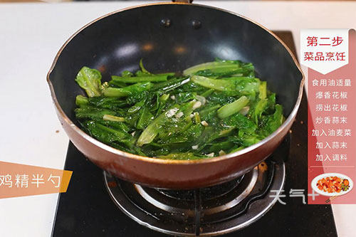 3.加入油麦菜快速翻炒,放入剩余的蒜末、盐半勺、鸡精半勺翻炒均匀盛出即可。