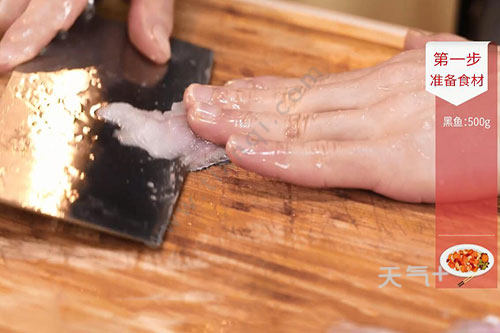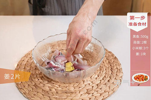 1.将黑鱼洗净,斜刀切片,每片约0.4cm厚。将片好的鱼片清水冲洗几遍去掉黏液。回锅黑鱼片的做法 回锅黑鱼片怎么做蒜苗斜切成段,小米椒斜切成小段,姜切末;