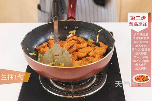 6.倒入鱼片回锅,调入白糖1少、生抽1勺、料酒1少、鸡精半勺翻炒均匀即可。