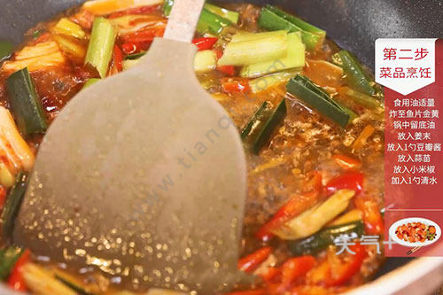 5.锅中留底油 ,放入豆瓣酱1勺、姜末、蒜苗白色部分、小米椒炒香。加入1勺清水,使酱料呈润泽冒泡状;