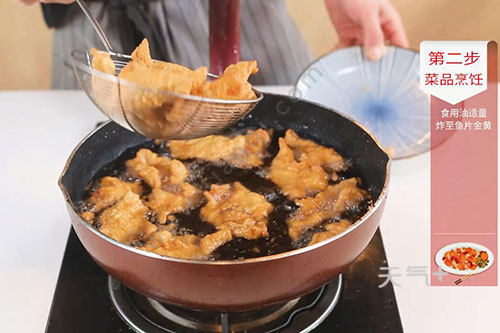 4.锅中放入适量油,油温烧至5成热,转中小火,鱼片一片片放入,炸至表面质硬松脆,色泽金黄色,控干油分;