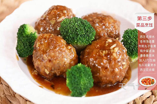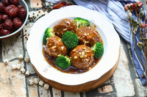5.锅中留底油,放入八角、姜蒜末爆香,加入生抽、适量清水、放入丸子煮至汤汁浓稠,盛出后放上西兰花点缀,浇上汤汁即可.