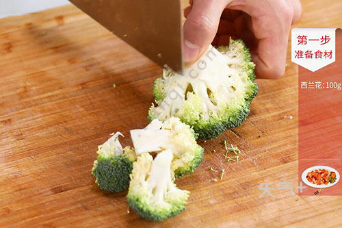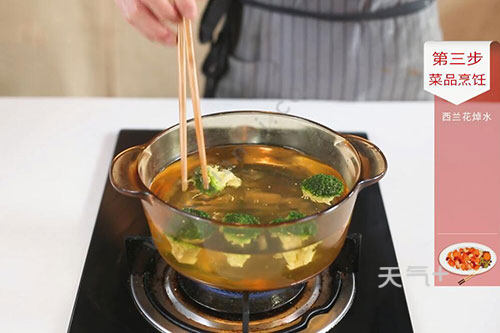 3.锅中放入适量水烧开,放入西兰花煮1分钟,捞出沥干备用;