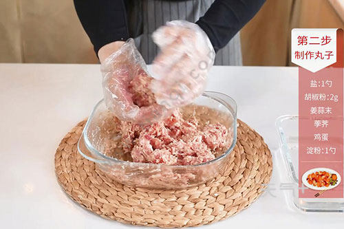 2.肉末中加入盐1勺、胡椒粉2克、荸荠、姜葱蒜末、鸡蛋。用筷子往一个方向搅拌上劲,加入淀粉1勺拌匀。手上粘点水,取适量馅料团成丸子;