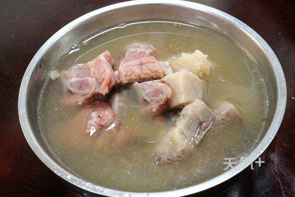 2.锅里加清水,大火煮开,然后加入排骨用水煮沸,去掉油沫。香芋排骨汤的做法 香芋排骨汤怎么做