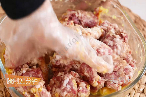 2.猪肉末中加入盐1勺、鸡精半勺、料酒1勺、葱姜末搅拌均匀,加入适量清水、淀粉、鸡蛋拌匀后腌制20分钟;