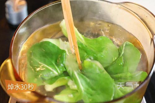 6.青菜洗净切4份。放入锅中焯水30秒,捞出摆盘。将煮好的狮子头捞出摆盘,锅中的汤汁中加入半勺鸡精、1勺水淀粉勾芡。将芡汁淋在狮子头上即可。
