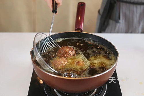 3.锅中倒入适量油,油温烧至6成热,将肉馅团成丸子,放入锅中炸制成金黄色捞出;