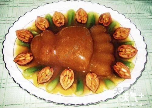 兰花熊掌是一道地方名肴,选用熊掌为主料,佐以青虾、油菜心、火腿、冬笋等辅料烹制而成。具有补气养血、祛风除湿、健脾胃、补筋骨的功效。