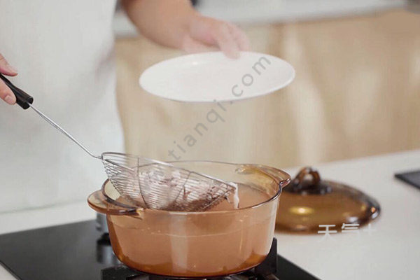 2.锅中倒入适量水烧开,放入鱿鱼须焯水2分钟然后捞出待用。