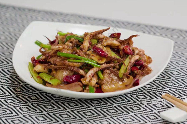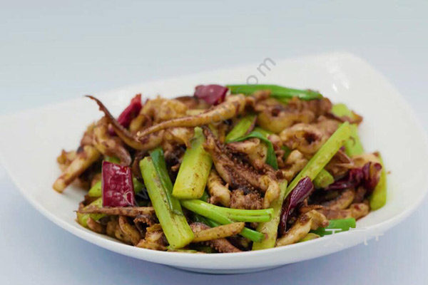 鱿鱼怎么做好吃 鱿鱼炒芹菜做法鱿鱼须洗净切小,五花肉切片,芹菜切段、干辣椒剪段,锅中水烧开,放鱿鱼须焯水2分钟捞出,油温烧至7成热,放五花肉煸至出油,加豆瓣酱、姜丝蒜片、花椒粒、干辣椒段炒出红油,放芹菜段、鱿鱼须炒2分钟,加入白糖、胡椒粉、盐、鸡精、蚝油、孜然粉、葱段炒半分钟即可。
