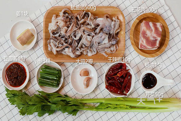 鱿鱼须500克,五花肉100克,小葱3根,大蒜2瓣,干辣椒10克,芹菜50克,蚝油1勺,豆瓣酱1勺,姜1块