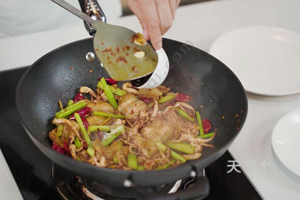 4.加入白糖1勺、胡椒粉1克、盐半勺、鸡精半勺、蚝油3克、孜然粉3克、切好的葱段,继续翻炒半分钟即可出锅。