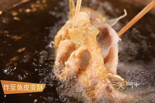 2.锅里放入足量的油,烧至7成热,手提鱼尾,在锅上用勺往鱼身上淋热油,使鱼定型;