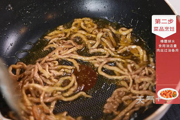 3.锅中放入适量油,油温烧至7成热,放入肉丝炒至变色,盛出待用;
