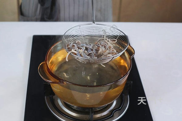 2.倒入适量温开水,放入海蜇皮汆烫10秒,捞出沥干。
