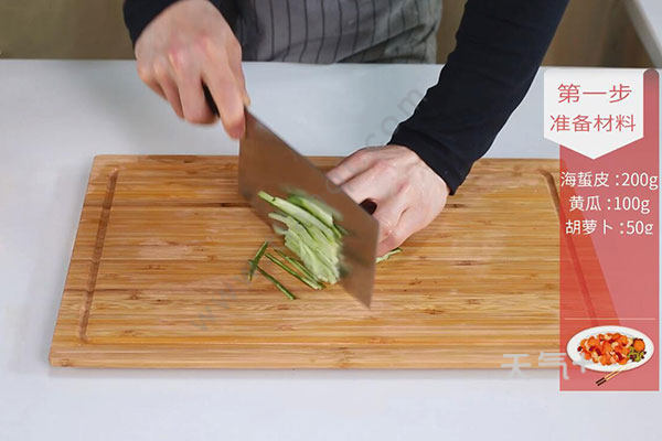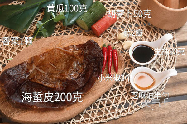 海蜇皮200克,黄瓜100克,胡萝卜50克,香菜1颗;