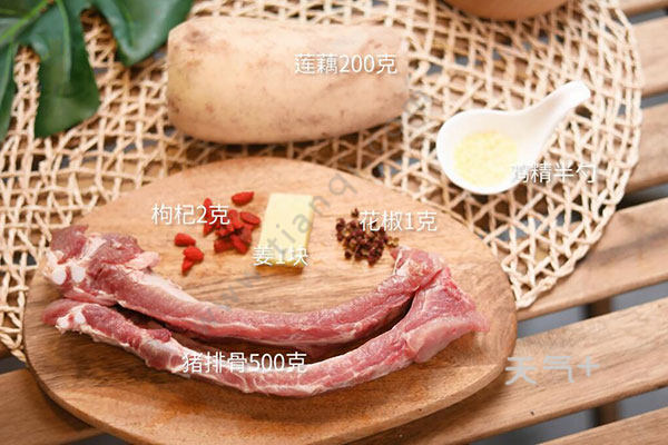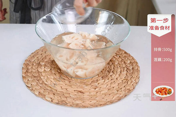 1.排骨洗净,放入清水中浸泡30分钟,莲藕去皮洗净,切成滚刀块放入清水中浸泡。姜1块切片;