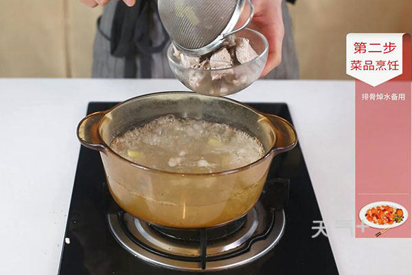 2.将排骨、姜片、料酒1勺放入锅中大火煮开,捞出排骨洗净;
