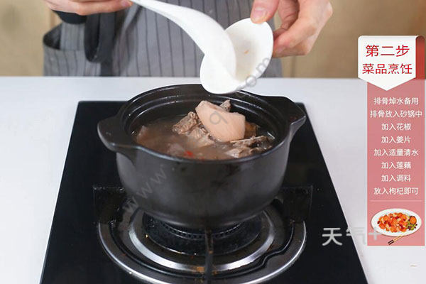 排骨莲藕汤的做法 莲藕排骨汤怎么做排骨洗净浸泡30分钟,莲藕去皮切滚刀块,将排骨、姜片、料酒放入锅中大火煮开,捞出排骨洗净,砂锅中放排骨、姜片、花椒、清水大火煮开,换小火慢煲30分钟,加莲藕、枸杞煮沸后小火慢煲1小时,放盐、鸡精拌匀。