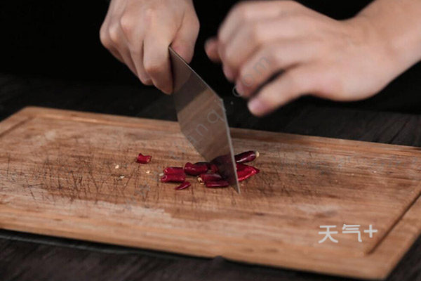 2.红椒切成小丁、干辣椒切开,切一些葱花。