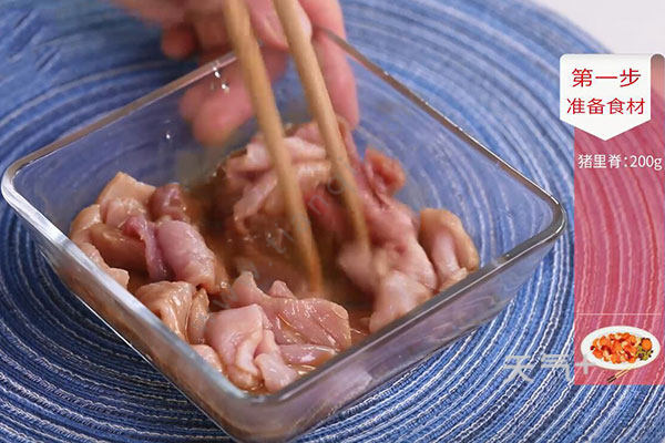 1.猪里脊洗净切小片,放入生抽1勺、料酒1勺、淀粉1勺拌匀腌制10分钟;