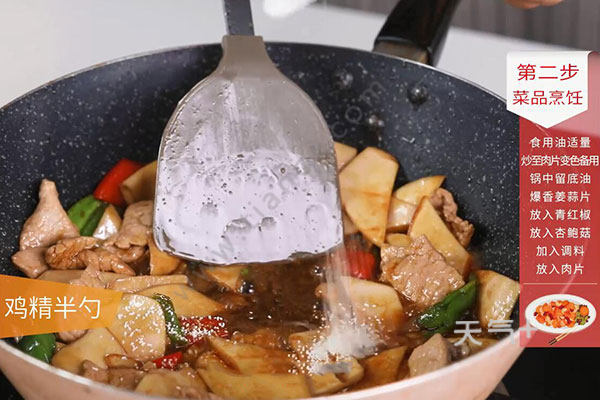 4.锅中留底油,爆香姜蒜片,放入杏鲍菇炒至断生,放入青、红椒炒匀,放入肉片翻炒,加入蚝油1勺、盐半勺、白糖1勺、老抽半勺、料酒半勺、清水1勺翻炒均匀,加入鸡精半勺,水淀粉1勺炒匀即可盛出。