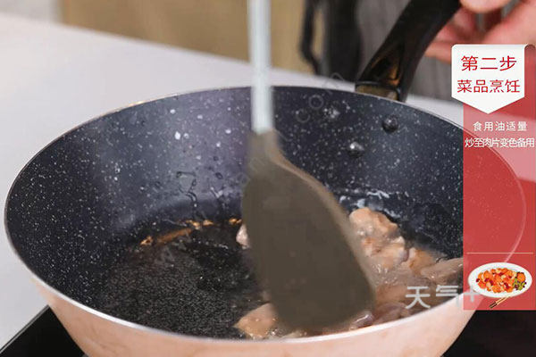 3.油温烧至6成热,放入肉片炒至变色,盛出待用;